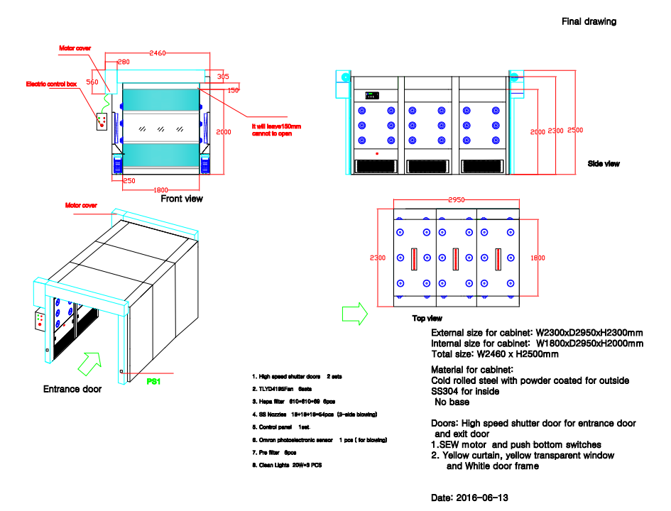 Description: Air shower is a kind of partial clean equipment which is installed at the place between the clean and non-clean room. It’s used for people and goods to shower before entering the clean area. After using it, the dust could effectively be reduced to enter the clean area and maintain the normal working status.We can assembly air showers or passages in different lengths as per the number of people that may enter into the clean room.